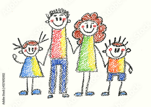 Kids Drawing Style Happy Family Mother Father Son Daughter Happy