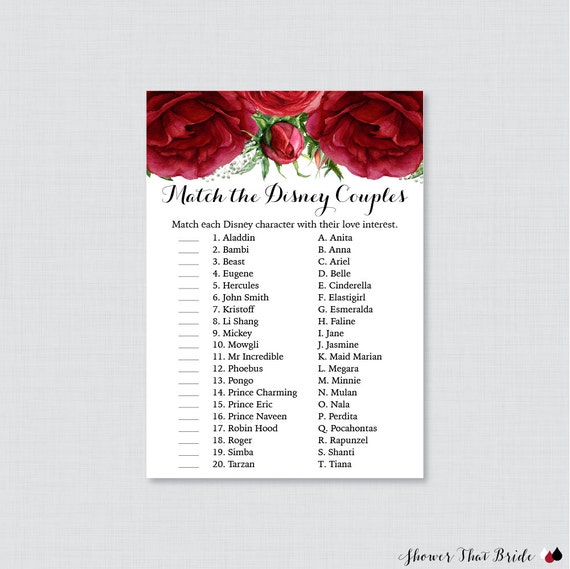 Red Roses Disney Couples Match Game Printable Red And Green Flower Bridal Shower Famous Couples Match Game Winter Wedding Shower Game 0026