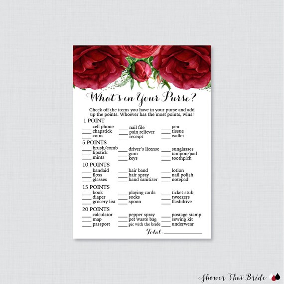 Red Roses What S In Your Purse Game Printable Red And Green Flower Bridal Shower Purse Game Winter Christmas Bridal Purse Raid 0026