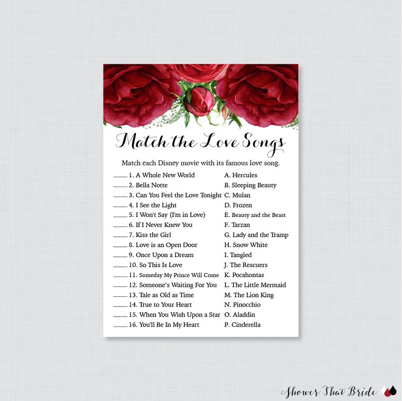 Red Roses Love Songs Match Game Printable Red And Green Floral Bridal Shower Disney Love Song Game Winter Christmas Bridal Shower 0026