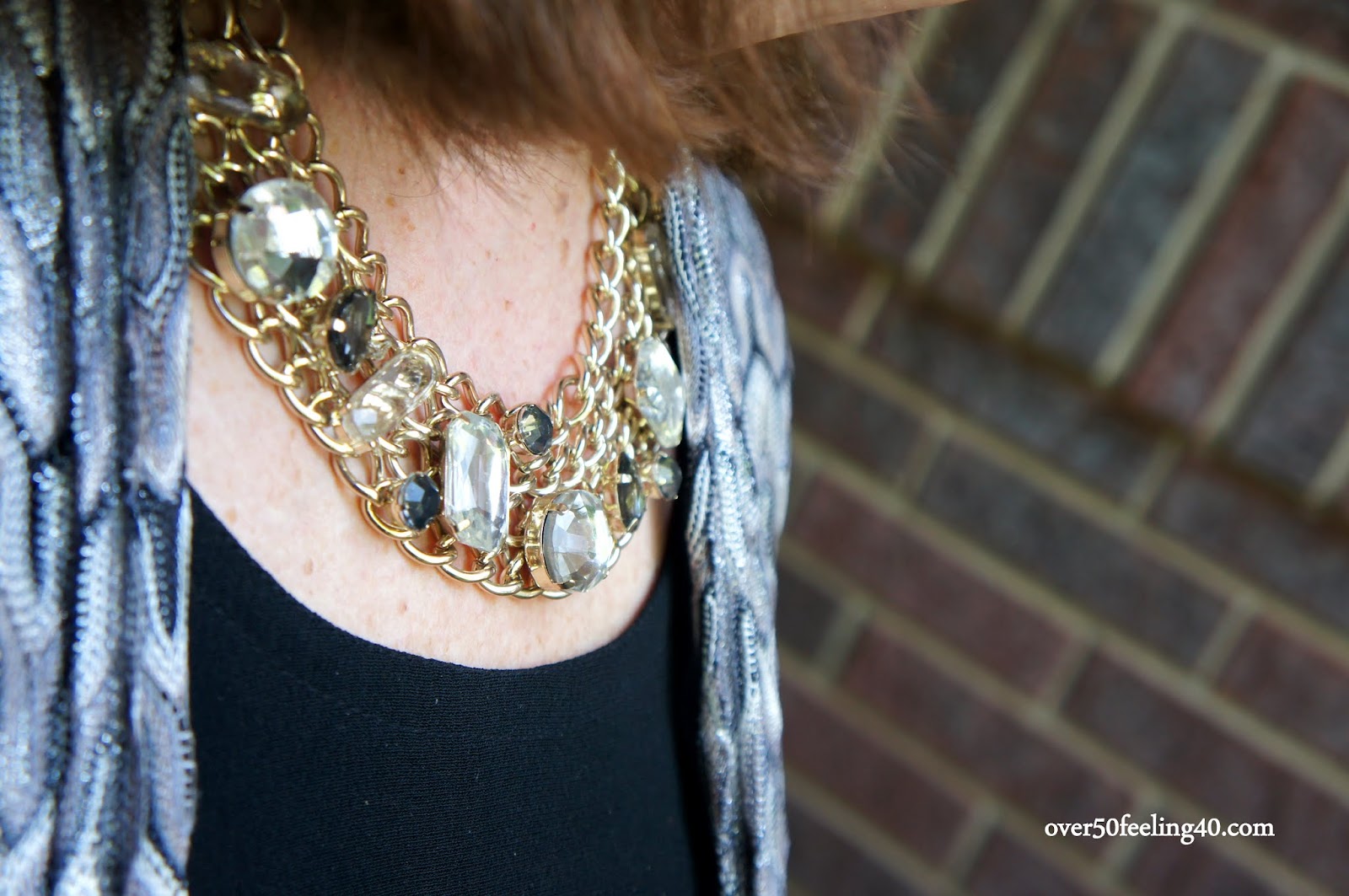 Recently, I was the featured speaker at a local CHICO'S event and everyone in attendance received a special discount for the evening. So, I went home with this lightweight, sparkly duster and gorgeous necklace!! I felt very appropriate for the evening.