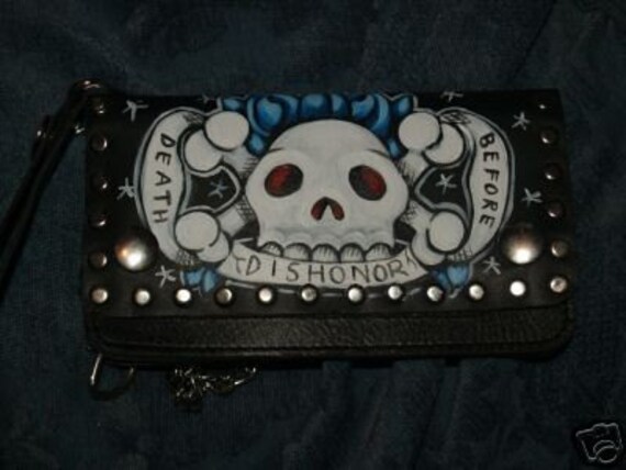 Tattoo Wallet Skull Handpainted Death Before Dishonor Sailor Rockabilly With Chain Crossbones